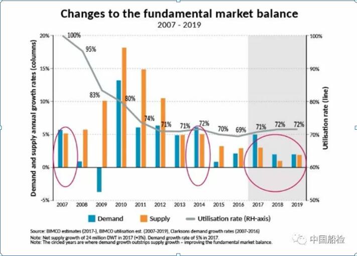 BIMCO预测,2018年的需求增长率将达5%,船队将增长3%,市场基本面平衡将会提高2%。然而,如果船队的增长率保持在最初的2%,它将会促使市场增长3%,这是自2004年以来的最高水平。在那时,基本面平衡增长了3.7%(2004年的需求增长率为10.5%,供给增长率为6.8%)。